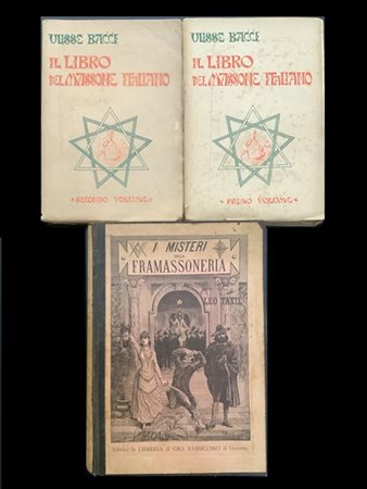 [MASSONERIA] BACCI, Ulisse. Il Libro del Massone Italiano. Roma: Centenari, 1908-1911. 2 volumi di questa curiosa opera di Massoneria che include il secondo volume raro a trovarsi. Si aggiunge: TAXIL, Leo. I Misteri della Frammassoneria. Genova: Fassicomo, 1888. Non collazionato e difetti da esaminare.