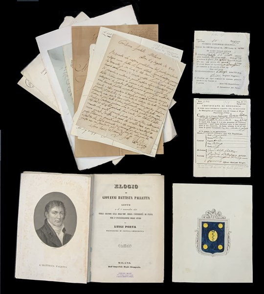 [MEDICINA - PALLETTA Giovan Battista (1748-1832)] Lotto di lettere e documenti autografi e indirizzati al celebre medico Milanese che ebbe modo di curare lo stesso Napoleone. Nel lotto anche: PORTA Luigi. Elogio di Giovanni Battista Palletta. Milano: regia Stamperia, 1851. 8vo, ritratto di Palletta in antiporta, privo di legatura.