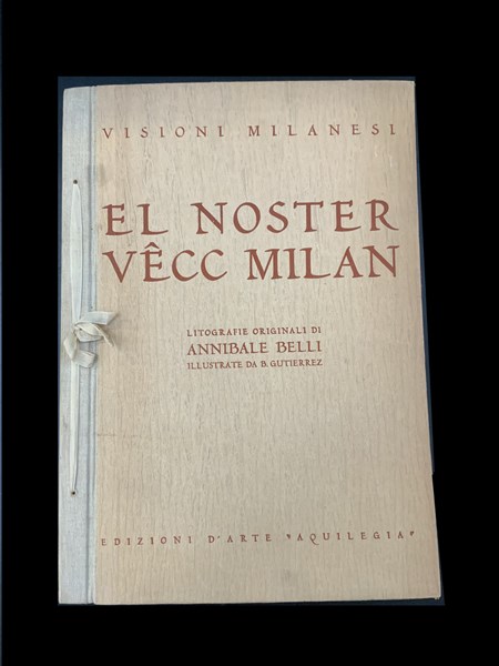 [MILANO] BELLI, Annibale. El noster vecc Milan. Milano: Pizzi e Pizio, 1936. Folio. Album di 77 litografie. Legatura coeva in mezza tela con lacci, titolo in rosso sul piatto superiore. Interessante album di visioni milanesi interpretate dal Belli ed illustrate da B.Gutierrez. Copia n. 449