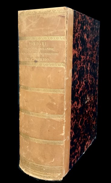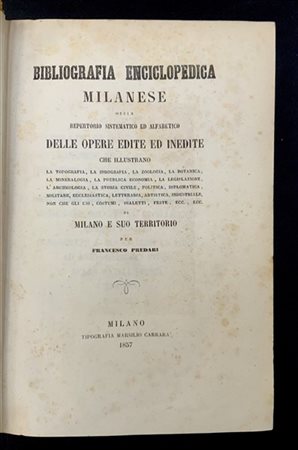 [MILANO] PREDARI, Francesco. Bibliografia enciclopedica milanese ossia repertorio sistematico delle opere edite ed inedite di milano e suo territorio. Milano: Carrara, 1857. 8vo, legatura coeva con dorso in pelle, titolo e decori in oro al dorso. Celebre e dettagliata bibliografia dedicata a Milano e circondario