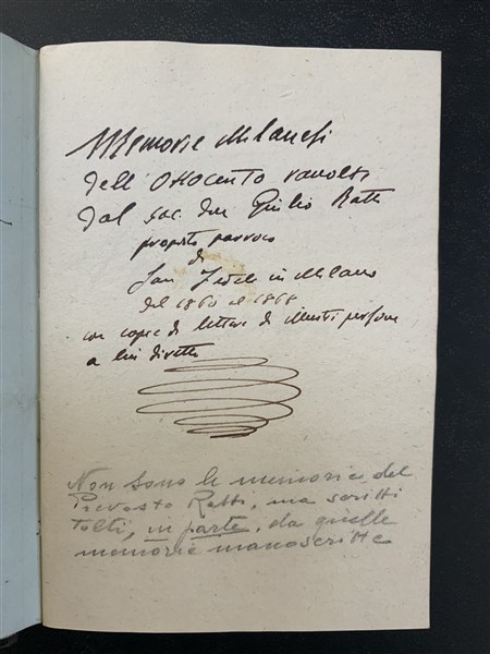 [MILANO] RATTI Giulio (1801-1869). Memorie milanesi dell'ottocento c.1860. diario manoscritto, 107 carte vergate a mano. Piccola raccolta di una parte delle memorie di Giulio Ratti, prevosto di San Fedele e in quella veste, confidente di molti illustri personaggi cittadini. Tra gli avvenimenti citati, Antonio Boggia, famoso omicida, la calata dei cosacchi su Milano, il tentato assassinio del duca di Parma nonchè le copie di lettere a lui spedite da personaggi tra cui Alessandro Manzoni e Massimo d'Azeglio.