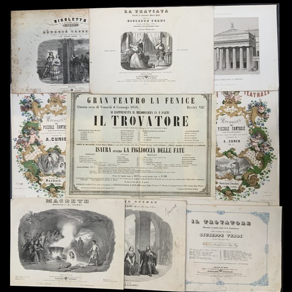 [MUSICA - VERDI]. Serie di manifesti e frontespizii relativi a importanti opere dell'auore quali Il Trovatore alla Fenice il 6 gennaio del 1854, Il Rigoletto, La Traviata. INSIEME a un biglietto che veniva gettato dal loggione in una serata dedicata a Verdi