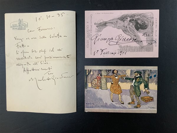 [MUSICA] GIORDANO, Umberto. Lettera autografa datata 16.10.35 indirizzata a Ferruccio; Giuseppe GIACOSA (1847-1906). Cartolina del Teatro La Scala con firma autografa