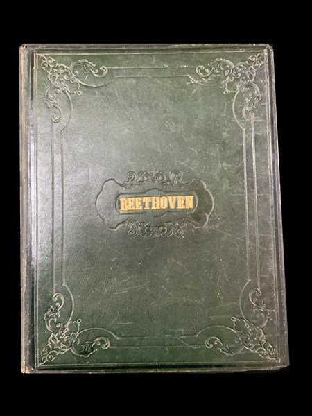 [MUSICA] Lotto di sonate di BEETHOVEN e LISZT pubblicate da Druck una Verlag von Holle. 4to che raccoglie una trentina di sonate di Beethoven in grande e bella legatura in pelle verde con incisioni e fregi con la scritta “Beethoven” in oro al piatto. Sguardie in seta.