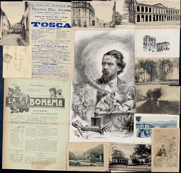 [MUSICA] PONCHIELLI, Amilcare (1824-1886). Una lettera autografa del compositore e una serie di documenti relativi alla musica e al teatro d'opera. Nel lotto anche un grande ritratto litografico stampato da Rossetti e di mano di Vespa
