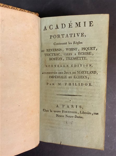 PHILIDOR. Academie portative contenant les regles du reversis, whist, piquet, trictrac. Parigi: Fournier, s.d. 16mo, bella copia in pelle coeva decorata in oro. Non collazionato e difetti da esaminare.