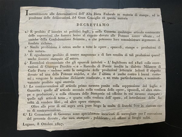 [PORTA Carlo]. Raccolta di numeri di giornale, editti, e ephemera legati alla figura di Carlo Porta e alla sua produzione letteraria. Tra i più curiosi si segnala un decreto del Canton Ticino datato ( Ottobre 1827 con cui si mettono al bando le poesi in dialetto di Porta,