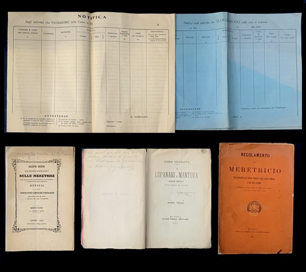 [PROSTITUZIONE] - Curioso lotto di studi e opuscoli dedicati al tema della prostituzione: FENOLIO Giuseppe Cesare. Alcuni cenni filosofico-pratici sulle meretrici modo speciale di governarle e di custodirle a minor danno della società. Torino: Botta, 1849. 8vo, brossura editoriale. [CON:] GIUDA ISCARIOTA [VALERA Paolo] I lupanari di Mantova studio sociale con coda di Caino. Mantova: Colli, 1880. 8vo, brossura editoriale stampata [E:] regolamento sul meretricio nell'interesse dell'ordine pubblico, della salute pubblica e del buon costume. Milano: Pirola, 1891. 8vo, brossura editoriale. [E:] Fogli di notifica per gli individui che entrano nelle case chiuse [c.1920-30]