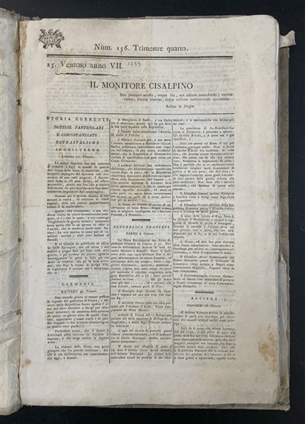 [REPUBBLICA CISALPINA] Il monitore cisalpino. Milano: Netti, 1799. Folio, numeri 156-176 (manca il numero 173) legatura coeva in cartonato con titolo manoscritto al dorso. Ultimi numeri di questo giornale milanese diretto da Giuseppe Compagnoni prima e poi da Luigi Bossi, erede del "monitore italiano"