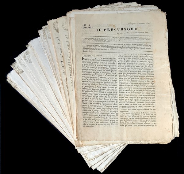 [RISORGIMENTO - BOLOGNA] Lotto di alcuni numeri di due giornali dei moti del 1831: Il Precursore. Bologna: Nobili, 1831. Primi 12 numeri e relativi supplementi dal 8 Febbraio al 12 Marzo [CON:] Il Monitore Bolognese: Sassi, 1831. Numeri dal 3 al 12 e relativi supplementi dal 15 Febbraio al 18 Marzo 1831.