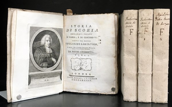 ROBERTSON, William. Storia di Scozia durando i regni di Maria e di Giacomo VI. Londra: A. Millar e T. Cadell, 1784. 4 volumi in 8vo, bel ritratto in antiporta, vignetta incisa in rame al frontespizio. Cartone coevo. Non collazionato e difetti da esaminare.