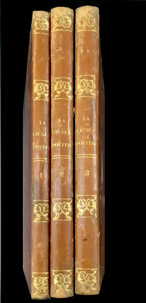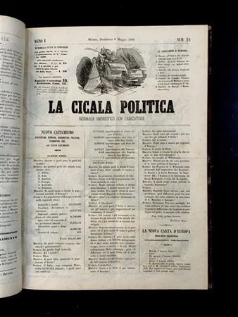 [SATIRA]. Bel lotto contenente vari volumi di giornali satirici del XIX secolo tra cui: 2 volumi rilegati de La Cicala Politica: giornale umoristico con caricature. Volumi degli anni 1861 e 1862 che includono tutti gli articoli di questo bisettimanale rilegato con titoli e incisioni in oro su pelle al dorso e piatti in cartone marmorizzato - Un volume de I burattini politici: giornale umoristico con caricature dal numero 1 del 2 luglio 1860 al 15 del 9 aprile 1861 - Un volume rilegato contenente tutti i numeri del Cassandrino. Giornale che si pubblica il Martedi', Giovedi' e Sabato a che ora gli pare. Roma : Tipografia Patern: 1848-1849. È una raccolta della rivista dal numero 1 di martedi' 4 luglio 1848 al n. 69 del 9 dicembre 1848 (l'ultimo dell'anno). Ogni numero si compone di 4 pp. (2cc.), rilegate in un tomo in mezza pelle con incisioni e titolo in oro al dorso. La rivista umoristica, fondata da Ximenes Ânacque con una fisionomia 'papalina', si caratterizzava per un indirizzo moderato che sfociava in un conservatorismo di stampo popolaresco. Bersagli della rivista, che ando' poi radicalizzandosi, furono Carlo Alberto e Gioberti.