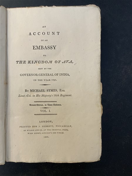 SYMES, Michael. An Account of an Embassy to the Kingdom of Ava, Sent by the Governor-General of India, in the Year 1795. Londra: Debrett, 1800. 8vo 3 voll. Solo testo, senza le tavole. Legatura coeva in cartonato (difetti). Copia da studio di questa seconda edizione di questo testo importante per lo studio delle prime relazioni britanniche nell'area. Non collazionato e difetti da esaminare.
