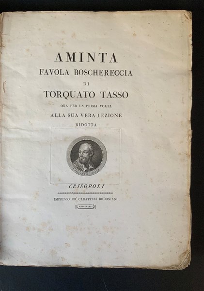 TASSO, Torquato. Aminta favola boschereccia. Crisopoli ma Parma] : Giambattista Bodoni, 1789. 4to (306 x 226mm). Vignetta incisa in rame con ritratto dell'autore al frontespizio e testastina calcografica incisa da Giuseppe Locatelli (fioriture e lievi difetti). La paginazione come in Brooks 380, ma senza le correzioni tipiche di questa tiratura: a p. 38, riga 14 "Novi Lumi", a p. 73, riga 2 "scola"; a p. 142, riga 1, "sciocchi". Cartone editoriale (manca il dorso, difetti)