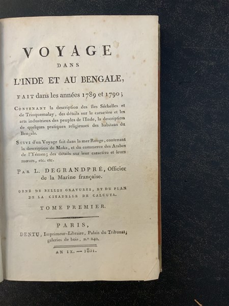 [VIAGGI] GRANDPRE, Louis-Marie-Joseph O'Hier de. Voyage dans l'Inde et au Bengale, fait dans les annees 1789 et 1790. Parigi: Dentu, 1801. 8vo, 2 voll. 5 tavole (di 7) più volte ripiegate (fioriture) Legatura coeva con dorso in pelle, titolo e decori in oro su tassello (dorso e piatti lisi). Testo completo. Prima edizione di questa importante relazione dedicata alla navigazione nel mare indiano. Non collazionato e difetti da esaminare.