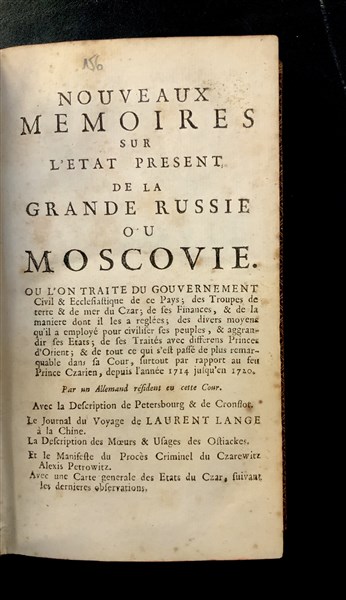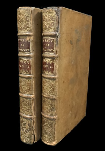 [WEBER (Friedrich Christian)]. Nouveaux mémoires sur l'état présent de la grande Russie ou Moscovie. Amsterdam: Pierre Mortier, 1725. 2 volumi in belle legature in piena pelle coeva e tagli rossi. Grande carta ripiegata della Russia incisa in rame. Non collazionato e difetti da esaminare. [2]