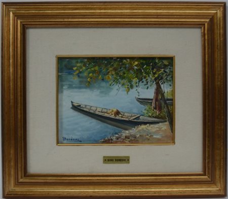 Gino Bordoni "Paesaggo fluviale e barche" olio su cartone telato (cm 15x20) Firm