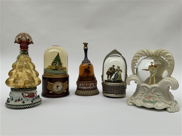 Gruppo di cinque boules de neige musicali di soggetti differenti. Vetro e resina policroma (h max cm 27) (difetti e restauri)