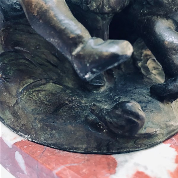 Ignoto del XX Secolo "Due bimbi e la lumaca" scultura in bronzo (h cm 16) poggiante su base in marmo. Tracce di firma