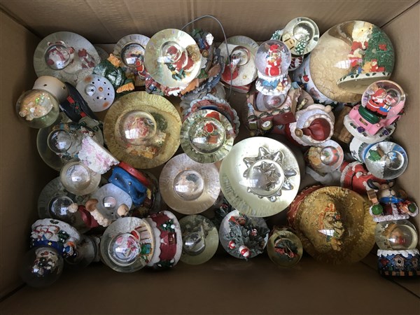 Cartone contenente numerose boules de neige a tema natalizio. Vetro e resina policroma, dimensioni differenti (difetti)