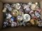 Cartone contenente numerose boules de neige a tema natalizio. Vetro e resina po