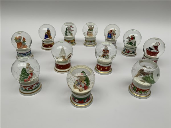 Manifattura tedesca Hutschenreuther, gruppo di dodici boules de neige a tema natalizio. Vetro e porcellana policroma (h cm 12) (difetti)
