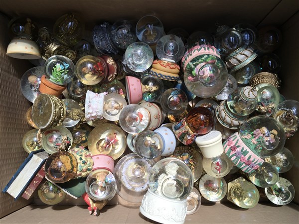 Cartone contenente numerose boules de neige mignon raffiguranti principalmente