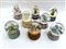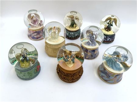 Gruppo di otto boule de neige natalizie con carillon raffiguranti angeli. Vetro e resina policroma (h max cm 15) (difetti)