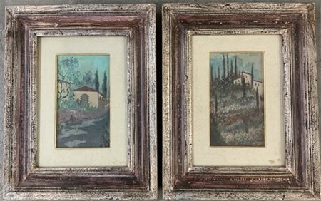 R.Bettini "Campagna toscana" e "Collina toscana" coppia di dipinti ad olio su compensato (cm 25x15) titolati, firmati e datati al verso 6/72. In cornici