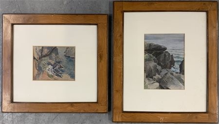 Firma indecifrata "Scogliere" due tecnche miste su carta (max cm 24x17) una firmata, in cornice
