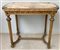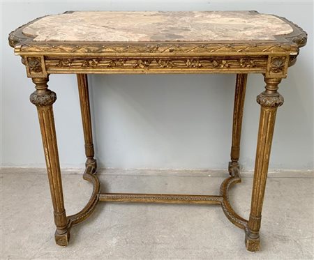 Tavolino da salotto in legno intagliato e dorato con gambe riunite da traverse e piano in marmo sagomato (cm 85x69x53) (difetti)