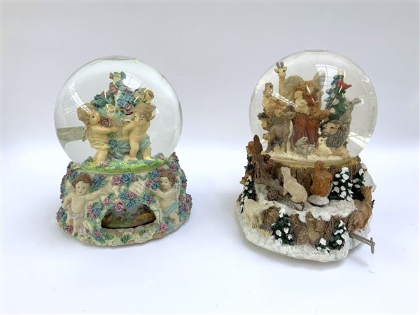 Lotto di due boule de neige con carillon raffiguranti angeli e animali. Vetro e