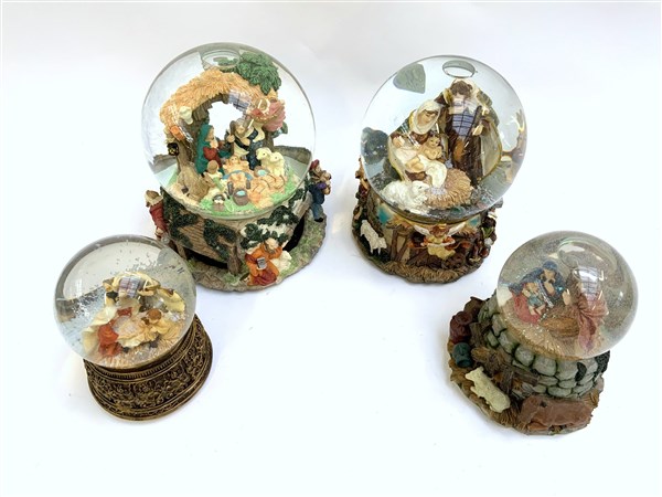 Gruppo di sette boule de neige a tema natalizio alcune con carillon. Vetro e re