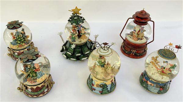 Gruppo di sei boule de neige con carillon a tema natalizio. Vetro, resina policroma e applicazioni in metallo (h max cm 21) (lievi difetti)