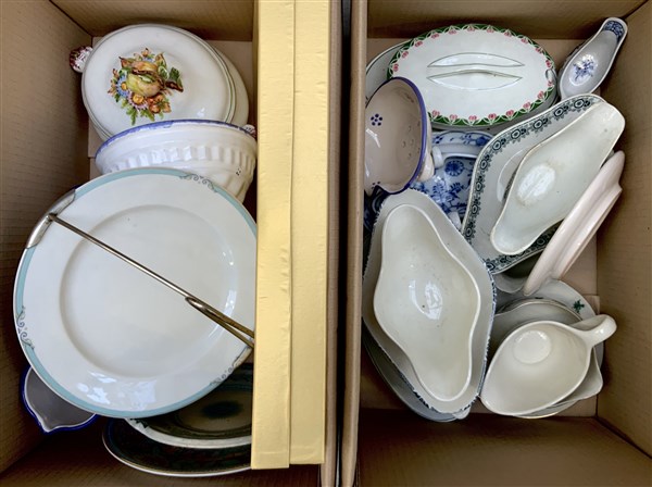 Lotto di due cartoni contenenti numerosi oggetti in ceramica per la tavola fra cui alcune salsiere di fatture ed epoche differenti (difetti)