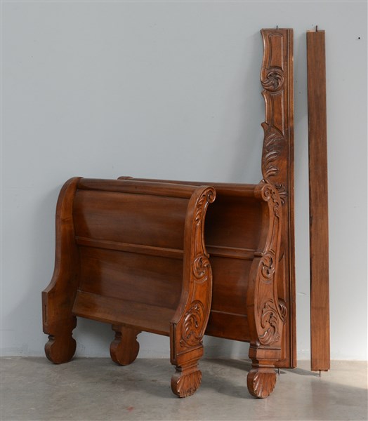 Letto a barca con montanti e fascia frontale scolpiti piedi a conchiglia e volute vegetali, secolo XIX (difetti e restauri)