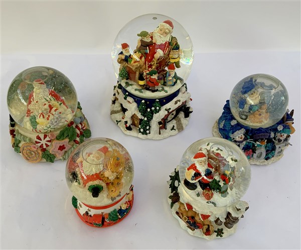 Gruppo di cinque boule de neige con carillon a tema natalizio. Vetro e resina policroma (h max cm 21) (difetti)