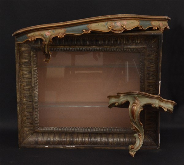 Lotto 1537 | Lotto compsto da una teca pensile e due mensole in legno laccato, intagliato e