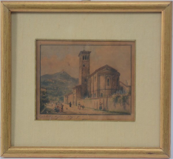 Teodolinda Migliara Sabaino "Paesaggio con monastero e figure" acquerello su car