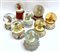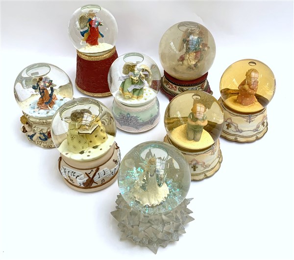 Gruppo di otto boule de neige con carillon raffiguranti angeli e bambini in preghiera. Vetro e resina policroma (h max cm 18) (difetti)