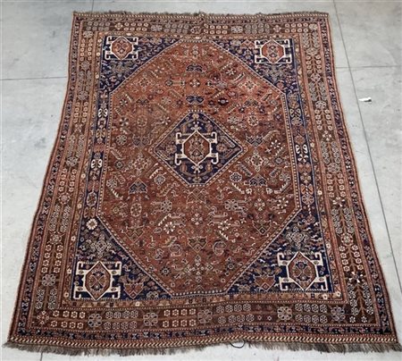 Tappeto Shiraz, Persia, prima metà secolo XX. Decoro con medaglione a fondo blu
