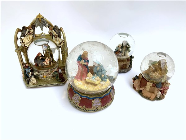 Gruppo di quattro boule de neige con presepi e carillon. Vetro e resina policroma (h max cm 21) (difetti)