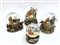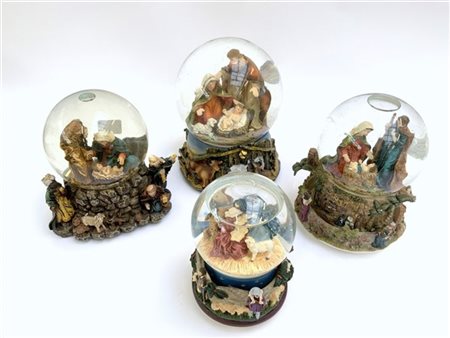 Gruppo di quattro presepi con boule de neige e carillon. Vetro e resina policroma (h max cm 20) (difetti)
