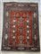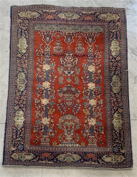 Tappeto Preghiera Keshan, Persia, secolo XX, Mirab, decorato con lampade votive, vasi fioriti e due colonne tortili su fondo rosso corallo. Bordura con cartigli decorati con paesaggi su fondo blu (cm 202x34) (Difetti, rotture e mancanze)