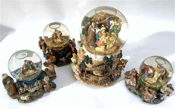 Lotto 1577 | Gruppo di quattro presepi musicali con boule de neige. Vetro e resina policroma