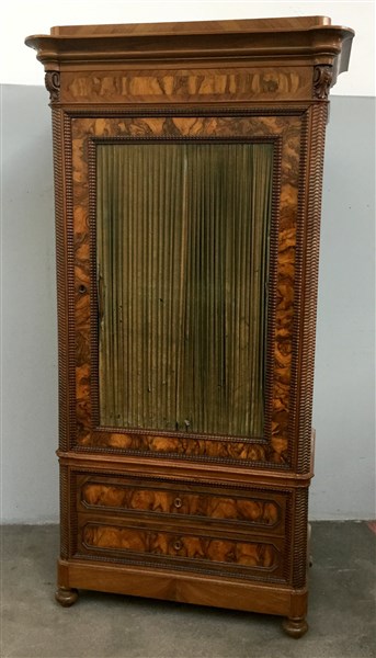 Lotto 1582 | Armadio lastronato in radica di noce ad un anta (mancante dello specchio) e due