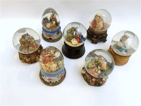 Gruppo di sette boule de neige raffiguranti la Natività. Vetro e resina policro