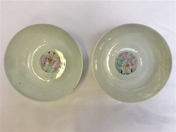 Coppia di ciotole in porcellana decorate con figure. Cina, inizio sec. XX (d.