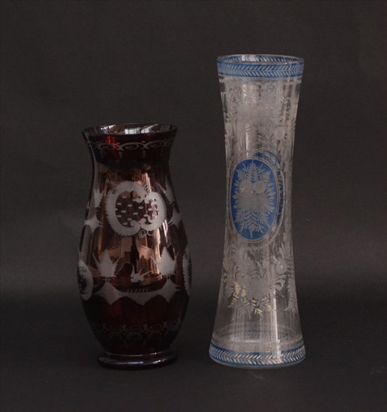Manifatura di Boemia, lotto composto da due vasi in cristallo rosso rubino e trasparente molato a fiori e paesaggi (h max cm 33) (difetti)