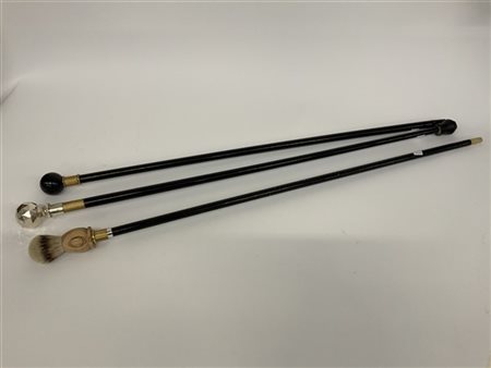 Lotto di tre bastoni da passeggio di cui uno sormontato da un pennello da barba